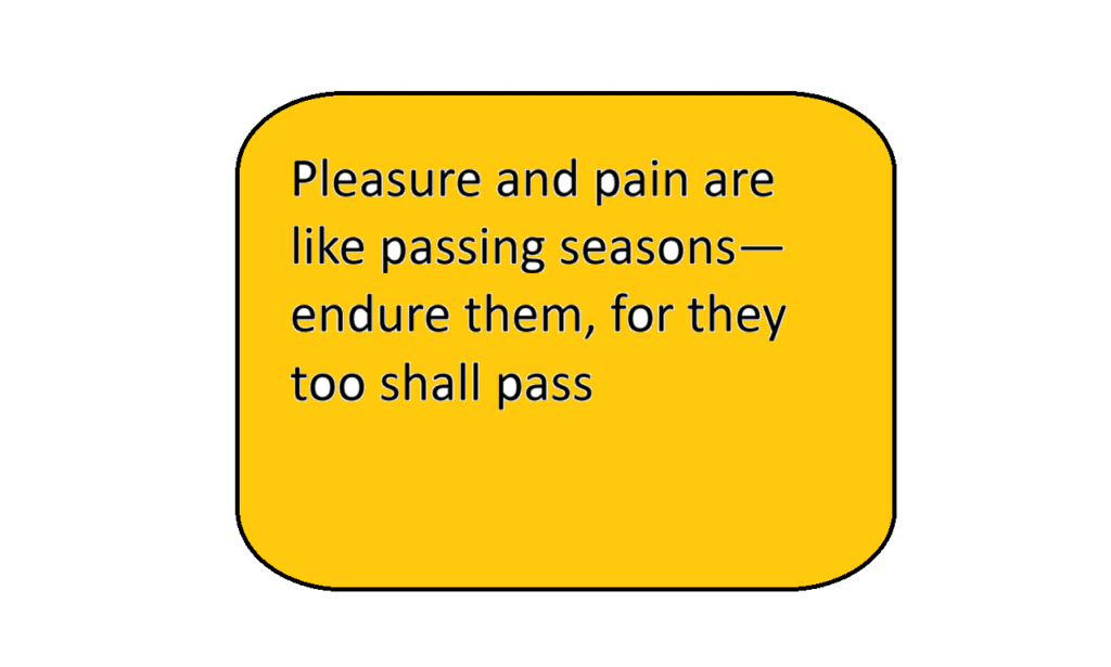 Second, Krishna reminds Arjuna that the temporary nature of these experiences is also inevitable. Just as day follows night, and summer is replaced by winter, all experiences—whether painful or pleasurable—come and go. Nothing remains fixed. This is the very nature of worldly life.