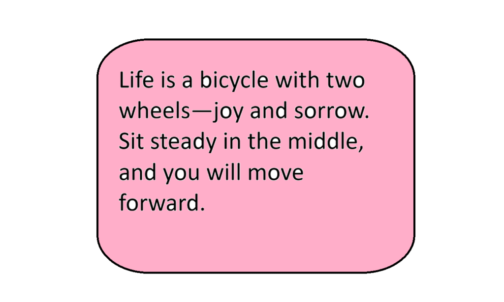 To understand this balance, imagine life as a bicycle. The two wheels are pleasure and pain, happiness and sorrow. Both are necessary; without either wheel, the bicycle cannot move forward. But if we cling to one wheel or try to ride sitting on a wheel itself, the cycle will topple. The right way is to sit in the middle seat, higher than both wheels. From there, we can use both wheels to move forward steadily. Similarly, in life, if we rise above the pull of pleasure and pain, we can move toward our higher goal. If we cling to either side, we get stuck and fall.